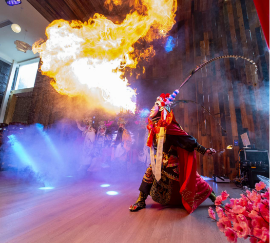 在磁器口古镇,川剧演员表演吐火。(郭思云 摄/视觉沙磁)