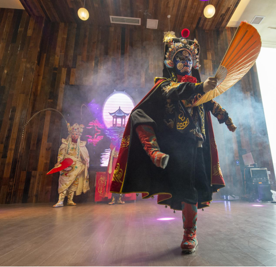 在磁器口古镇,川剧演员表演变脸。(郭思云 摄/视觉沙磁)