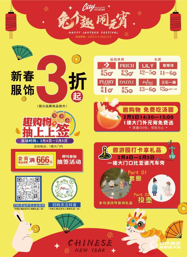 “2月3日—5日,我们将推出‘兔个趣·闹元宵’主题活动,市民可享受春季服饰3折起、醒狮表演、抽签、免费吃汤圆的多重福利。”王府井百货相关负责人介绍。