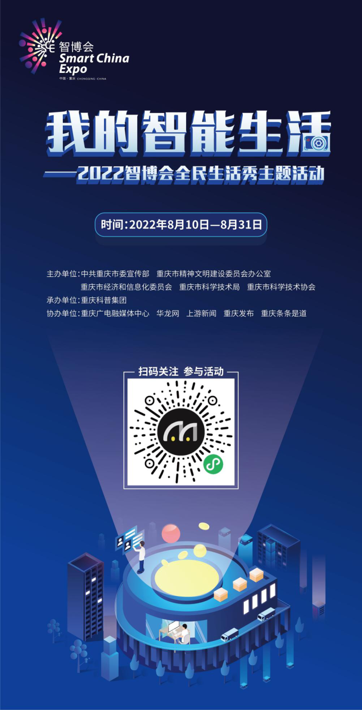 为迎接2022中国国际智能产业博览会隆重举行,广泛讲好群众身边的智博会故事,树立城市新形象,充分展示智博会举办5年来市民生活智能化的变迁,以“全民视角、智能生活”为切入点,增强市民对智能生活的感受度、体验度和贴近性,由中共重庆市委宣传部、重庆市精神文明建设委员会办公室、重庆市经济和信息化委员会、重庆市科学技术局、重庆市科学技术协会联合举办的“我的智能生活”2022智博会全民生活秀主题活动,8月10日在渝启动。