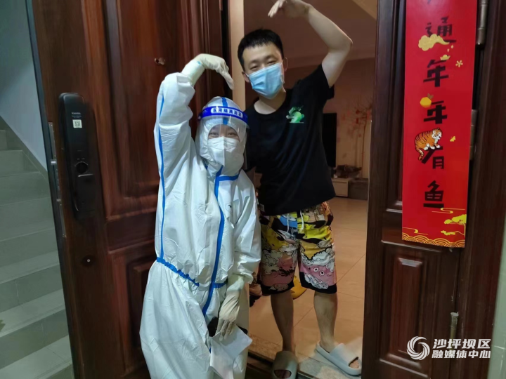 在一天天忙碌的防疫志愿服务工作中,原定的婚礼日子一天天临近,14日按照临时党支部的安排,李君轶担任核酸检测的信息录入员,穿上洁白防护服,从19:00开始上门入户,为居民登记采样信息。在自己家采样登记时,顾不上跟丈夫寒暄,直到丈夫问“今天是我们婚礼的日子哦,你什么时候能回家?”旁边的医生十分震惊,说道“今天你们结婚啊,恭喜恭喜!我帮你们合张影吧!”李君轶便在家门口与她丈夫拍了一张有特殊意义的“婚纱照”。