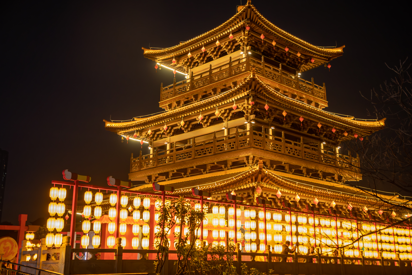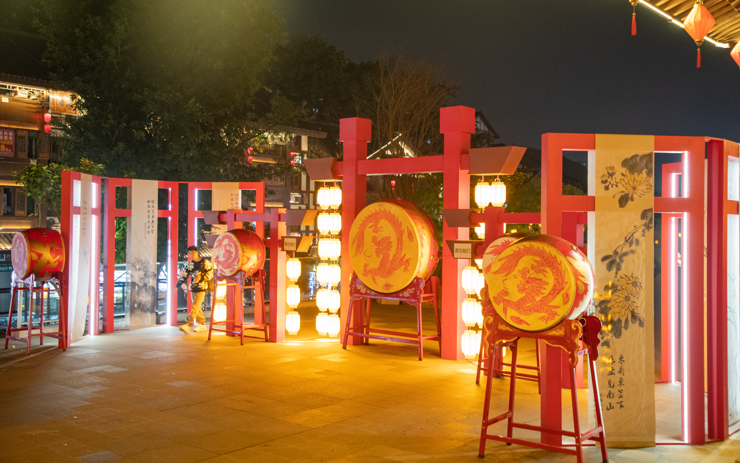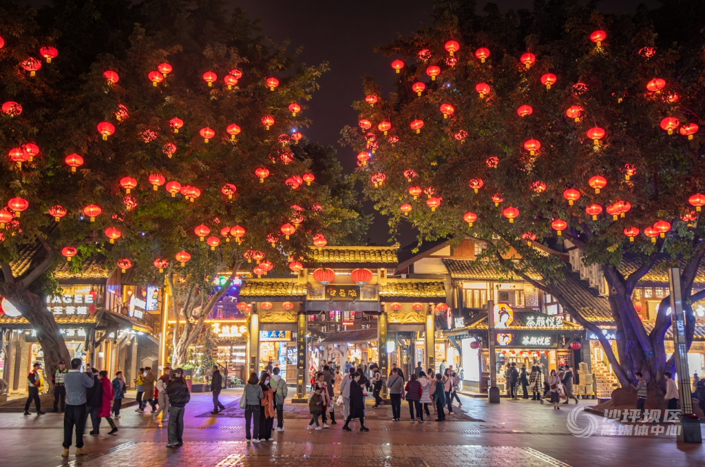 据介绍,今年,磁器口景区以磁童路步行街为“线”,以古镇十二巷。磁器口后街茶壶广场、吊脚楼广场、磁器长歌等标志性位置为“点”,点线结合布局迎春灯饰,扮靓城市夜景。迎春灯饰一共布置了传统灯笼、羊皮灯笼,迎春挂件共10000余件,同步在重要景观节点设置龙形灯组、古风灯笼等特色灯饰,打造不同层次、不通观感的打卡小景点,并辅以游园、猜灯谜、投壶等互动小游戏,营造浓厚的新春民俗文化氛围,让广大游客玩在磁器口,尽享中国年。
