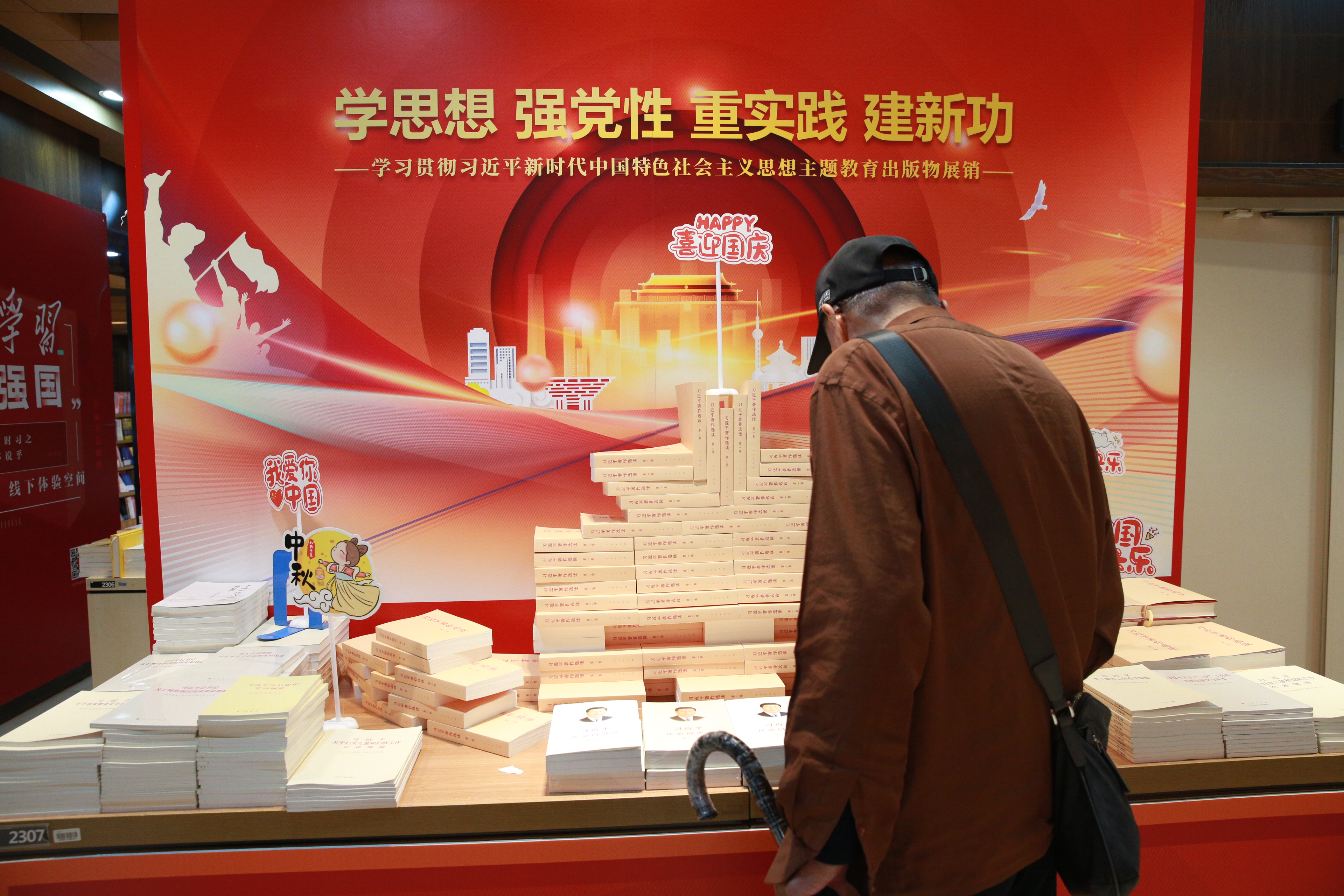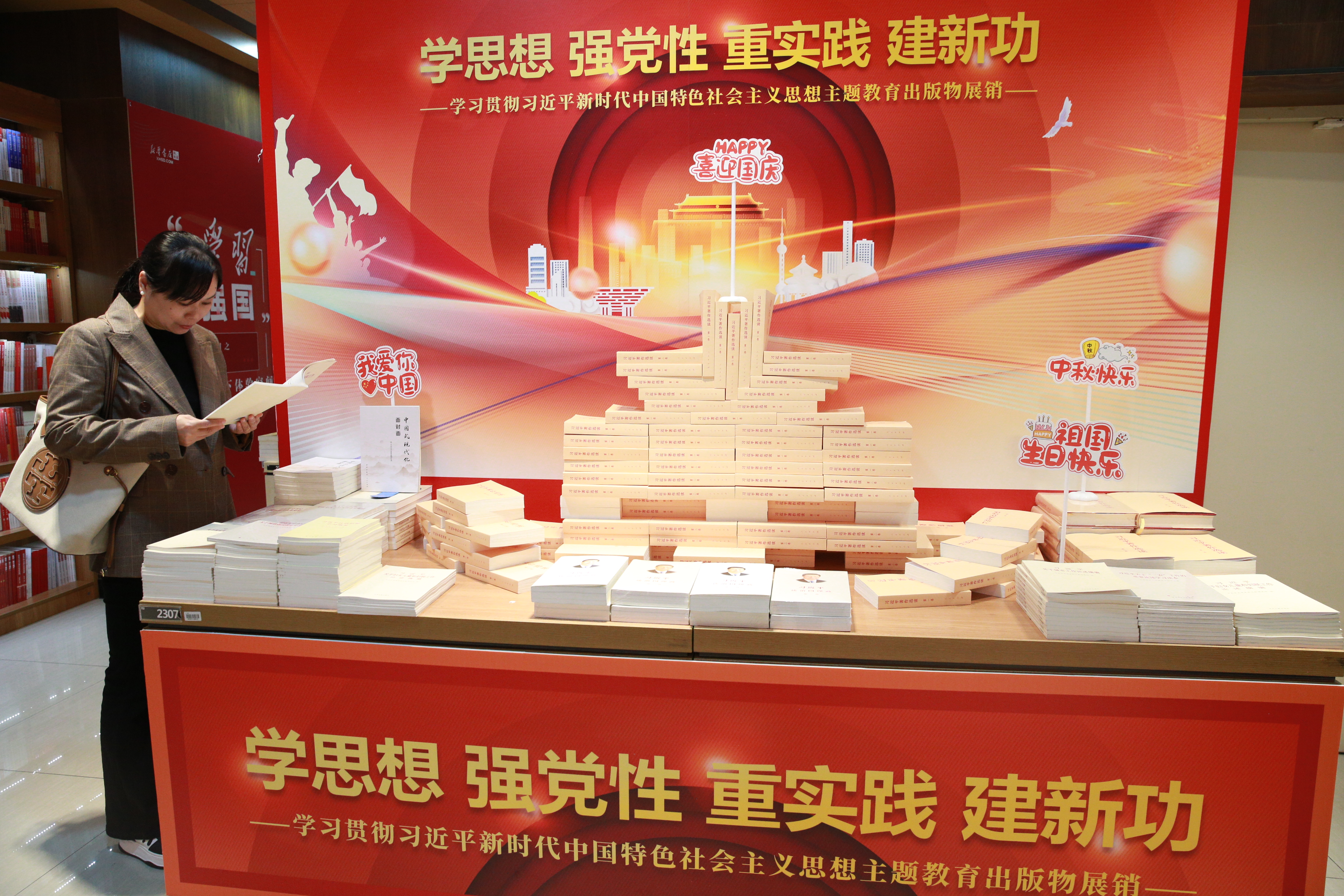 10月4日上午,记者在沙坪坝书城二楼看到,学习贯彻习近平新时代中国特色社会主义思想主题教育展区设在书城过道显眼位置,《习近平谈治国理政》《习近平著作选读》《中国式现代化面对面》等理论读物陈列整齐,展台上还设置了“中秋快乐”“我爱您中国”“喜迎国庆”“祖国生日快乐”等小标签,营造了喜庆祥和的节日气氛,不时有市民驻足阅读、选购。