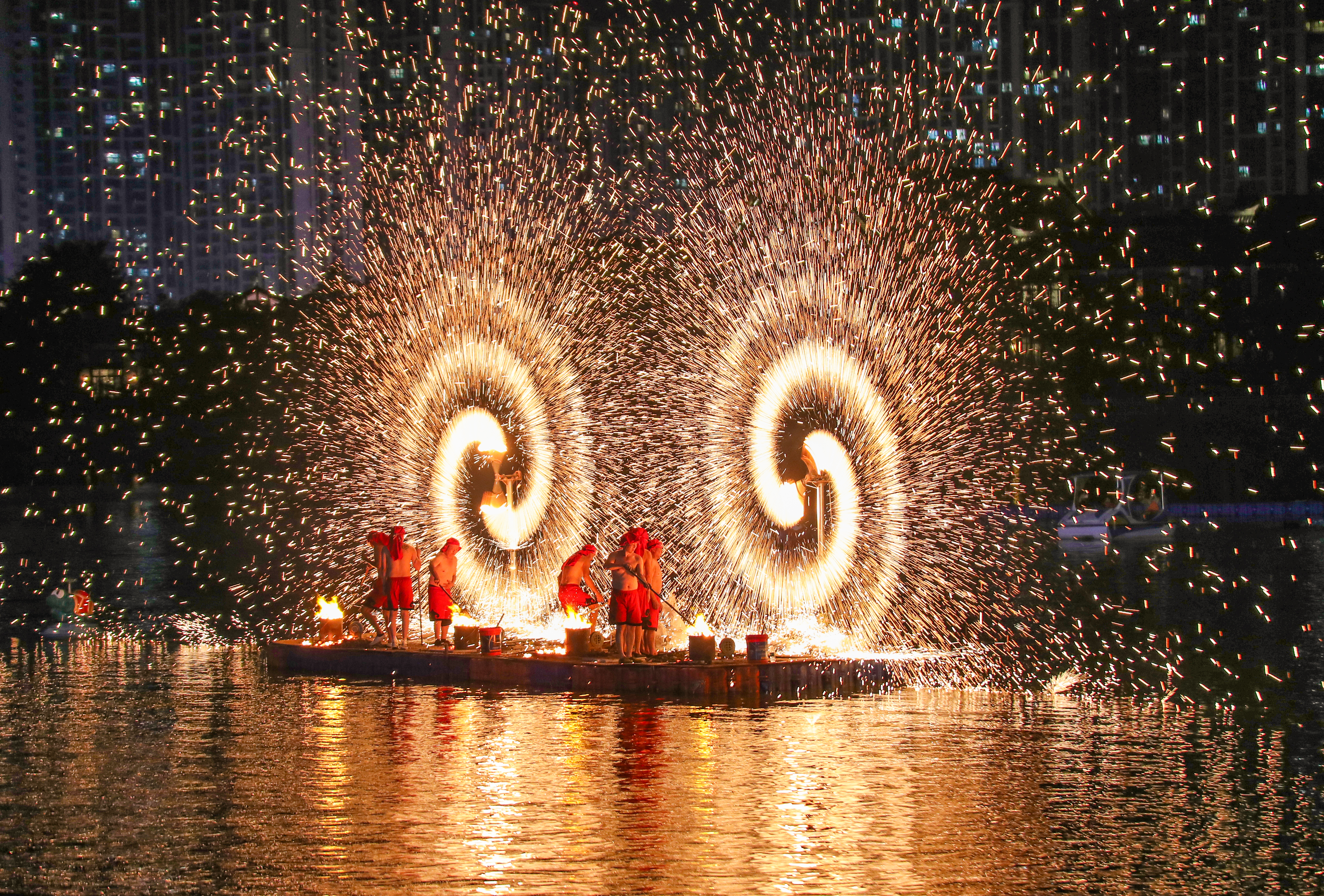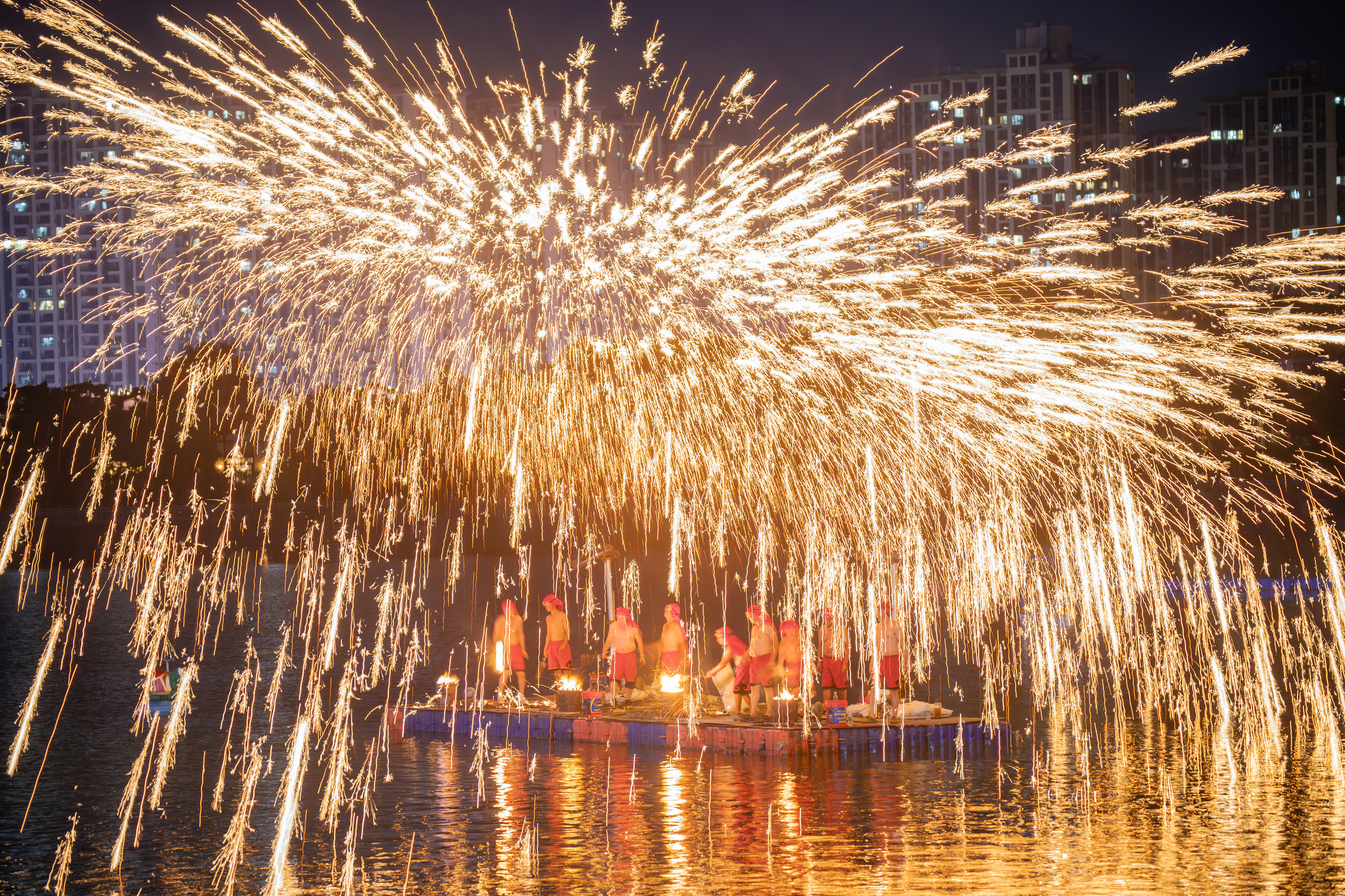 打铁花是一种富有地域特色的文化活动,随着时代的发展,打铁花已成为非物质文化遗产,以“火树银花”的绚烂展现中国式浪漫。据景区负责人介绍,中秋国庆8天长假期间,“打铁花”节目将于每晚9时20分在渝乐小镇人工湖上演,欢迎游客来打卡。