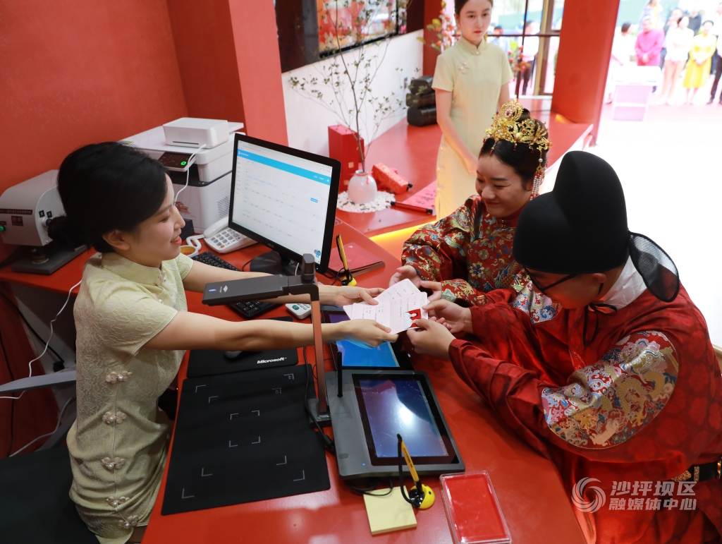 在集体婚礼和金婚典礼开始前,胡立和赵祺为沙坪坝区民政局婚姻登记处磁器口登记点揭牌。随后,该登记点正式投用并为两对新人办理结婚登记、发放结婚证。