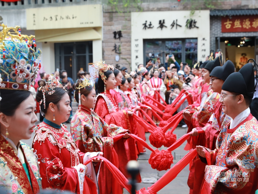 一朝喜结千年爱,百岁不移半寸心。10月19日上午,由重庆市民政局 、沙坪坝区政府联合主办的“磁处有喜▪幸福有你”2023沙坪坝区婚俗改革实验区建设系列活动暨“青春之城”集体婚礼和金婚典礼在磁器口后街吊脚楼广场隆重举行。10对新人和13对老人以婚礼文化为其内涵,以华夏衣冠为其外显,在满满的仪式感中共同镌刻美好幸福。