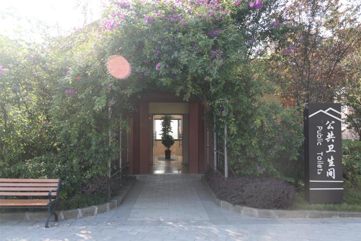 公厕外观墙体以淡黄色为主色调,门口处开放的花朵将门廊进行装点,整体造型朴素简洁而不失大方美观,与周边环境交相呼应、和谐统一。